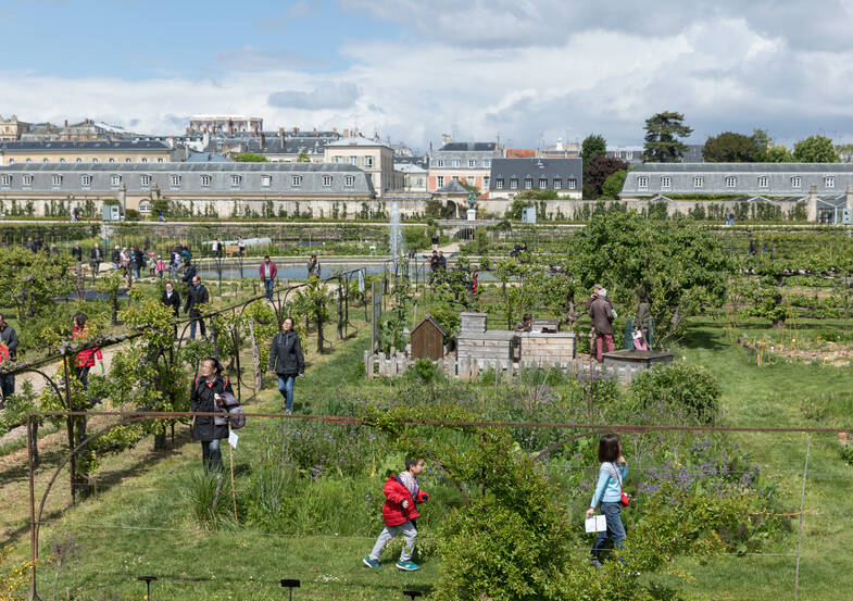 Munis d’un carnet, les participants arpentent le Potager du Roi à travers un parcours multisensoriel.