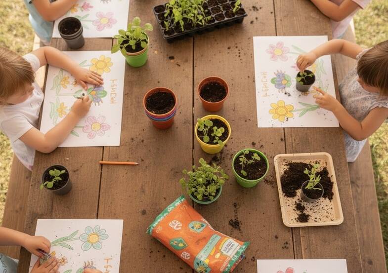 Les enfants dessinent leur jardin, sèment des graines et plantent un jeune plant (tomate, poivron ou aubergine).
