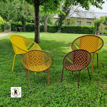 Confection de chaises et tables de jardin/terrasse en fils de pêche et de paniers à linge en fibres végétales.