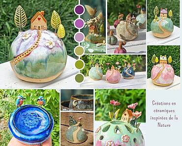 Céramiques décoratives inspirées de la nature, ainsi que des tisanes élaborées à partir de plantes cultivées artisanalement.
